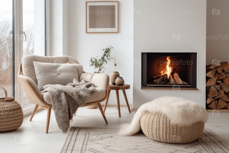 Интерьер яркой и просторной скандинавской гостиной, минималистский дизайн с прикосновением тепла, естественные текстуры, уютный уголок с камином и стулом