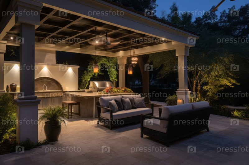 Элегантное переходное открытое жилое пространство с плавным потоком из интерьера во внешний, удобные сиденья, пышная зелень и сложное наружное освещение