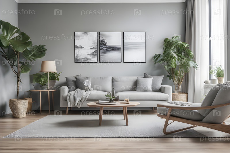 Уютный яркий интерьер гостиной с комнатными растениями, диванами и подушками, деревянным кофейным столом и картинками на стене