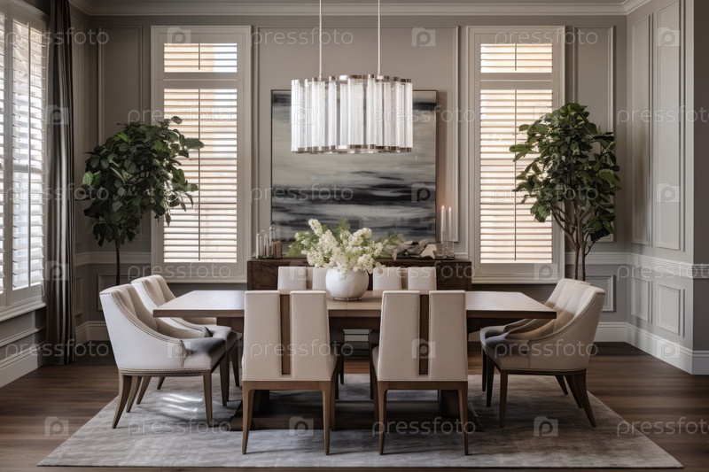 Интерьер элегантной и привлекательной столовой в переходном стиле с сочетанием современных и классических элементов, изысканными лампами, картинами и комнатными растениями