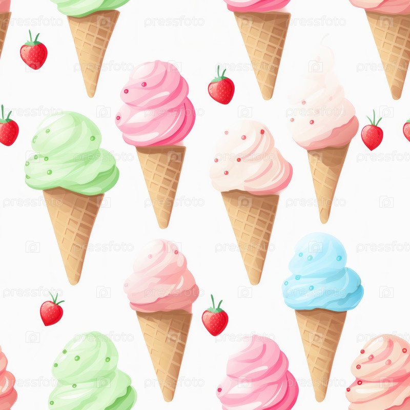 Бесшовная иллюстрация многоцветных мороженого с ягодами на белом фоне