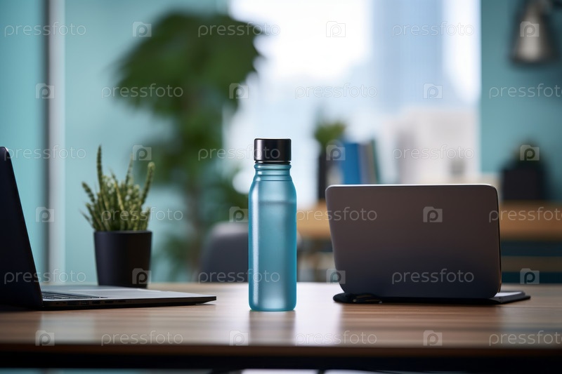 Закройте стеклянную бутылку на воде, поместите ее на современный офисный стол с ноутбуком и домашними растениями