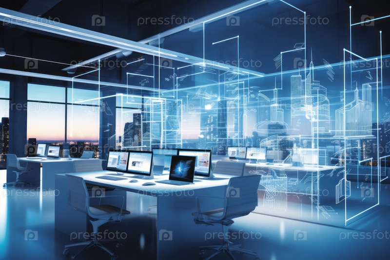 Футуристический офисный интерьер с абстрактными частицами и передовыми технологиями, которые продвигают бизнес в цифровую эпоху