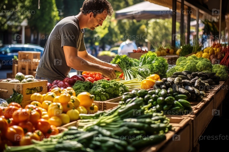 Человек продает свежие овощи, органические продукты на фермерском рынке
