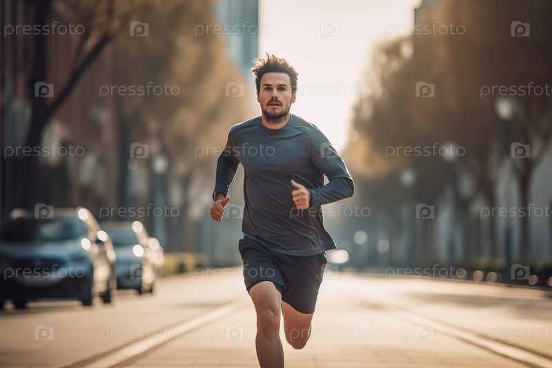 Энергичный взгляд на молодого человека, бегущего во время утренней пробежки снаружи, изображает жизнеспособность и преданность фитнес-программе