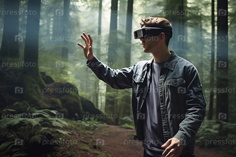 Изображение, которое передает концепцию дополненной реальности (AR), в которой молодой человек носит очки VR и взаимодействует с виртуальными элементами в лесу, иллюстрируя интеграцию цифровых перекрытий в реальные сценарии