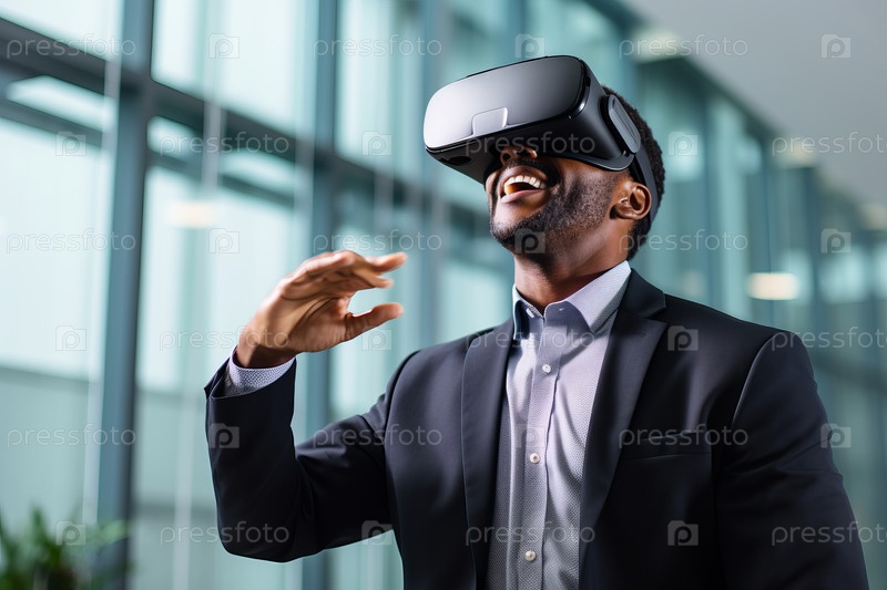 Улыбающийся афроамериканский бизнесмен в гарнитуре VR, среди офисного пространства в размытом виде, концепции виртуальной реальности в бизнесе, неглубокая глубина поля зрения, селективная фокусировка
