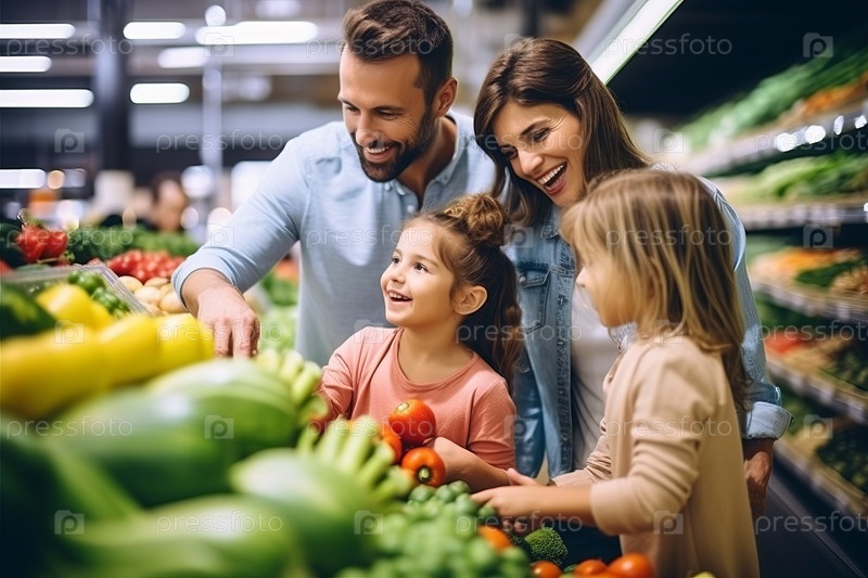 Счастливая семейная покупка вместе в разделе еды, с детьми, выбор фруктов и овощей, семейные гастрономические поездки