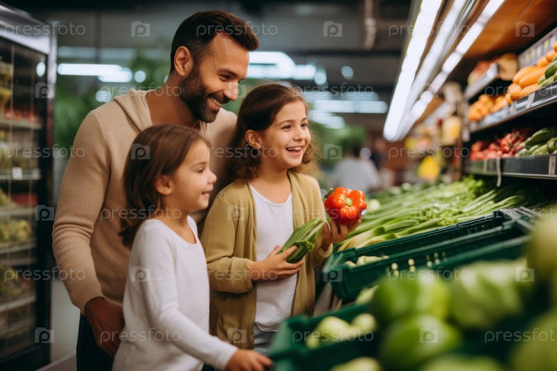 Счастливая семейная покупка вместе в разделе еды, с детьми, выбор фруктов и овощей, семейные гастрономические поездки