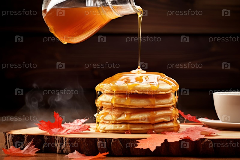 Композиция, изображающая кучу пушистых блинов с каскадом кленового сиропа, залитого над ними