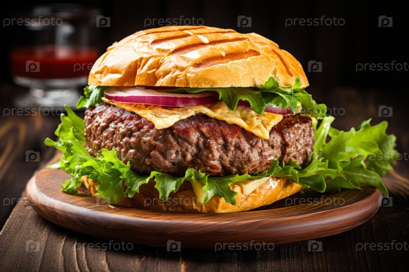 Закрыть вид на свежий, вкусный бургер на деревянном столе. неглубокая глубина поля зрения, селективная фокусировка