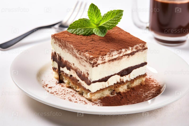 Свежее тирамису с шоколадом и листьями мяты на белом столе