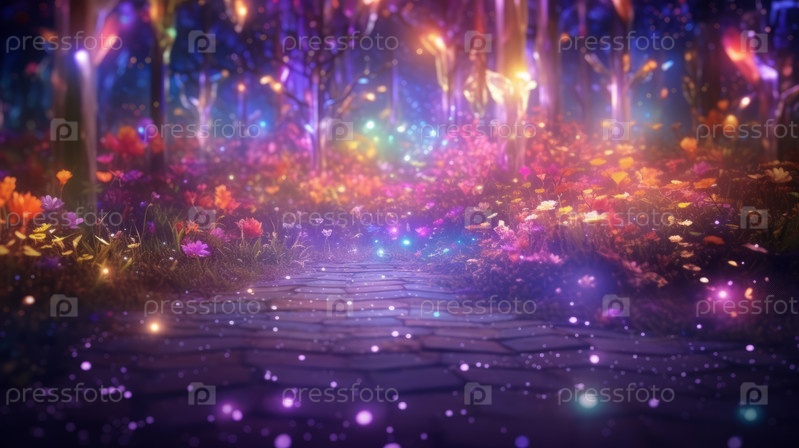Эфирный и мечтательный лесный фон с взрывом красочного боке, асфальтированная дорожка, цветы, увлекательная, потусторонняя атмосфера