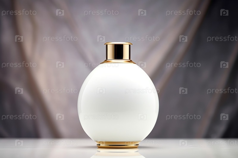 Белая бутылка косметики с позолоченной крышкой, с пустым пространством для макета на размытом фоне студии