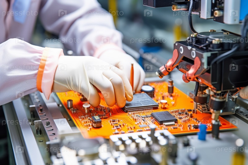 Вид сверху двух рук работника в перчатках, тщательно собирающего сложные компоненты на производственной линии микрочипов