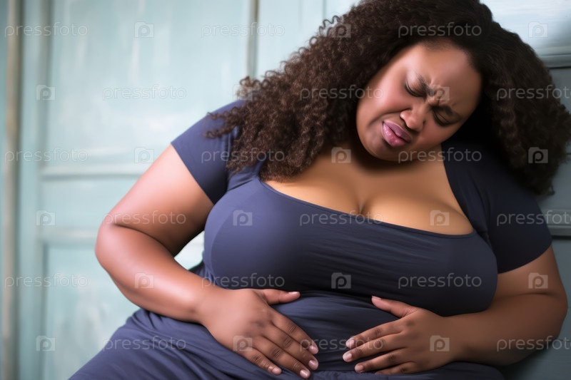 Мощный взгляд, иллюстрирующий боль женщины с избыточным весом, которая сжимает свой живот от боли, передающей интенсивность дискомфорта в животе