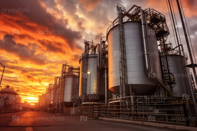 Впечатляющий вид, который захватывает внешний вид высокого промышленного комплекса на фоне драматического захода солнца, подчеркивающего величие современной промышленности
