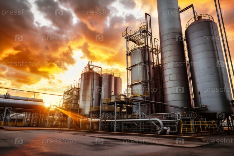 Впечатляющий вид, который захватывает внешний вид высокого промышленного комплекса на фоне драматического захода солнца, подчеркивающего величие современной промышленности