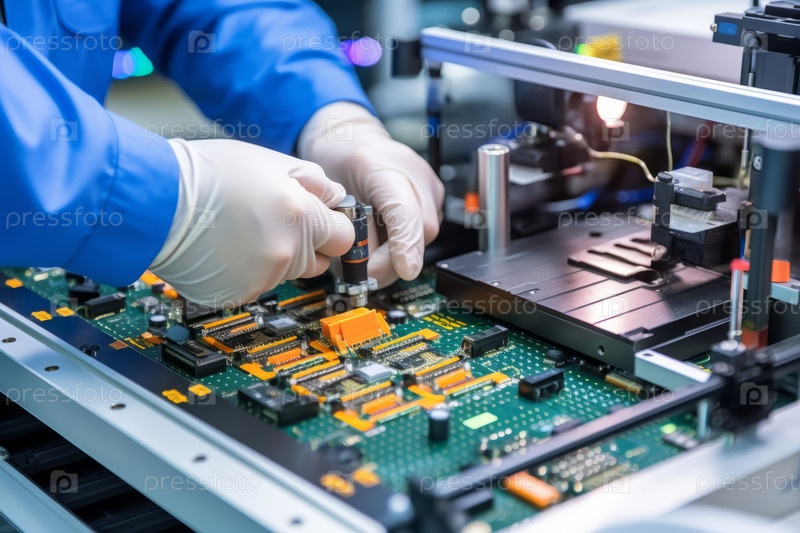 Вид сверху двух рук работника в перчатках, тщательно собирающего сложные компоненты на производственной линии микрочипов