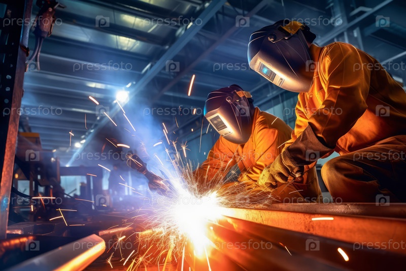 Сцена рабочих при сварке защитного оборудования и изготовлении металлических конструкций, мастерство в промышленной производственной среде
