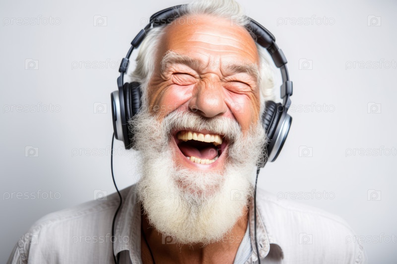 Портрет счастливого, жизнерадостного пожилого человека с бородой в наушниках на нейтральном светлом фоне - радость музыкальной концепции