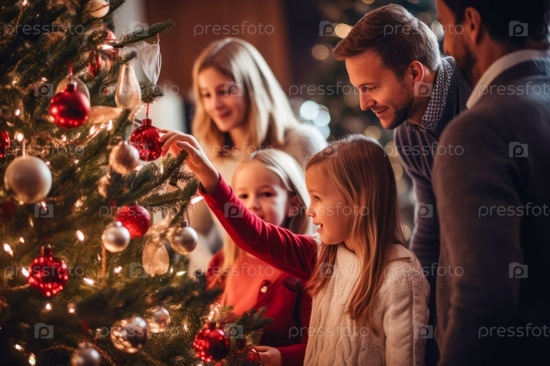 Семейное празднование собралось вокруг красиво украшенной рождественской елки, а дети повесили орнаменты, иллюстрирующие радость от праздничных традиций
