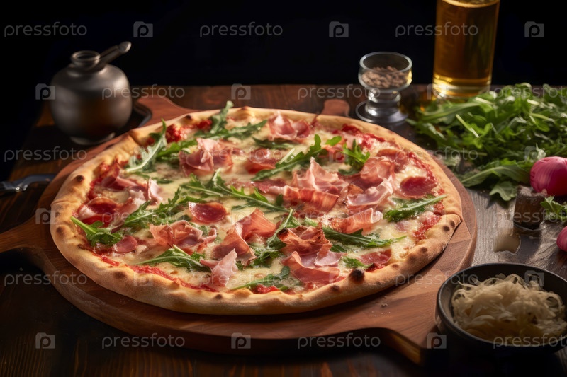 Закройте вид на вкусную пиццу с артишоками, prosciutto и ругулой на деревянной доске