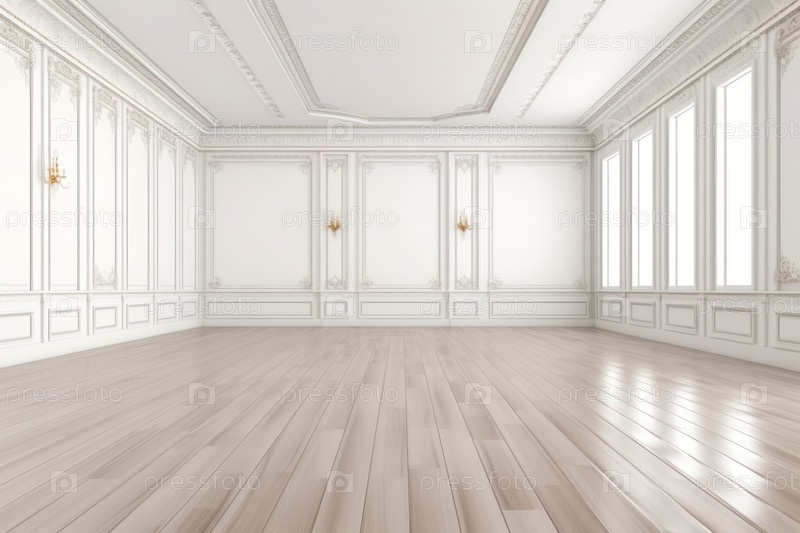 Интерьер пустой комнаты в классическом стиле с белыми стенами с литьями, штукатуркой и деревянным полом