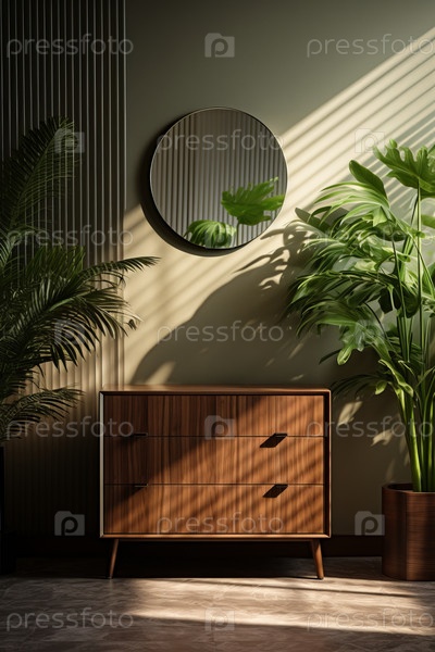 Интерьер элегантной гостиной с комодом, растениями и круглым зеркалом