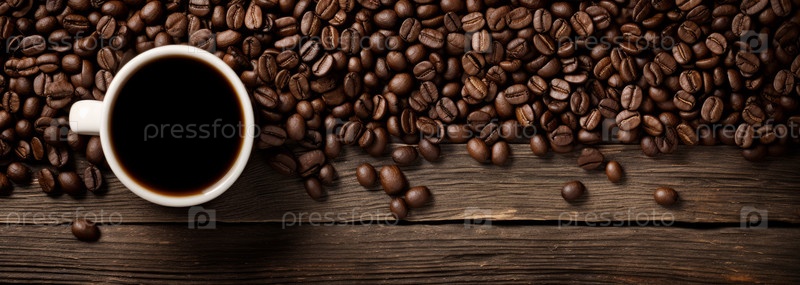 Вид чашки кофе и кофейных зерен на деревянном столе. Копировальное пространство, широкий баннер