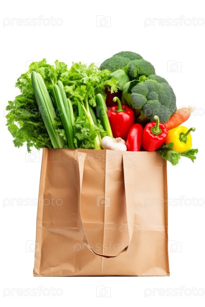 Бумажный пакет со многими различными видами продуктов питания и овощей, изолированные на прозрачном фоне