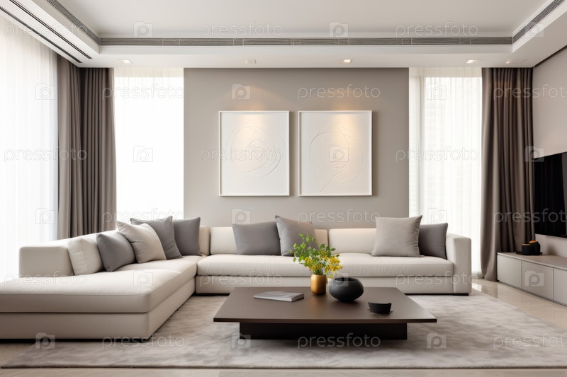 Интерьер яркой гостиной в современном минималистическом стиле с двумя картинами на белой стене, диваном и кофейным столом