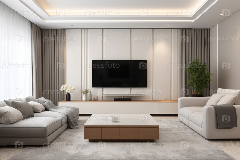 Интерьер гостиной в современном минималистическом стиле с большим телевизором на белой стене, диванами и кофейным столом