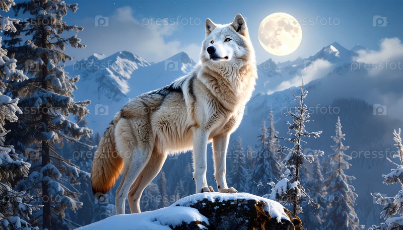 Величественный волк, стоящий под полнолунием в снежном горном лесу, символизирует примитивные инстинкты, стойкость и лидерство