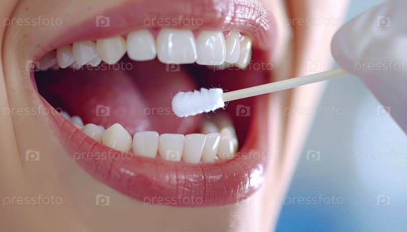 Близкий взгляд на медицинского работника, собирающего образец ДНК, проходя через внутреннюю часть рта человека в клинике