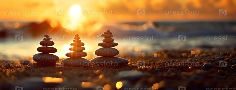 Нагроможденные камни на закате солнца на галечном пляже захватывают момент Дзен.Золотое сияние солнца омывает спокойный берег, волны шепчут истории глубины.Панорама с копировальным пространством