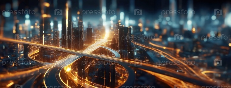 Футуристический городской пейзаж ночью с освещенными шоссе и высокими небоскребами, иллюстрирующими современную городскую жизнь или научно-фантастические концепции