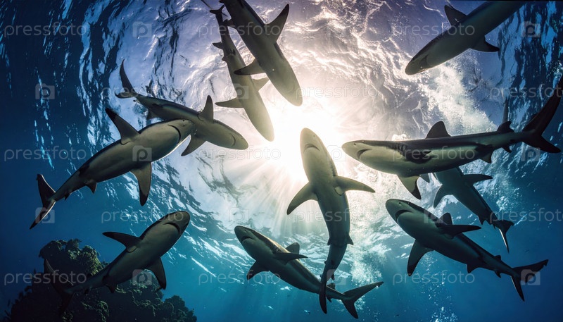 Школа акул, освещенная солнечным светом под водой, иллюстрирует морское биоразнообразие, океанскую жизнь или темы страха, силы и исследования