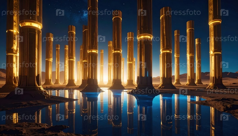 Золотые столбы, отражающиеся в воде под звездным небом, иллюстрируют футуристическую архитектуру, сюрреалистические пейзажи и космическую красоту для дальновидного повествования