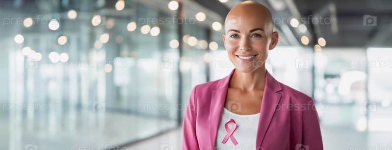 Уверенная женщина с лысой головой, в розовом блейзере и ленте для повышения осведомленности о раке молочной железы тепло улыбается