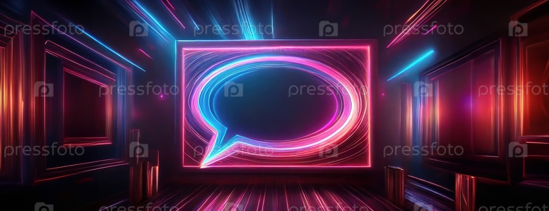 Неоновый пузырь речи в футуристической комнате, светящейся розовыми и синими оттенками