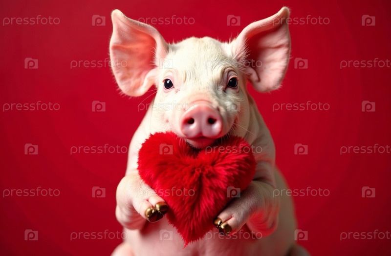Карта Дня Святого Валентина, свинья держит пушистое сердце на красном фоне
