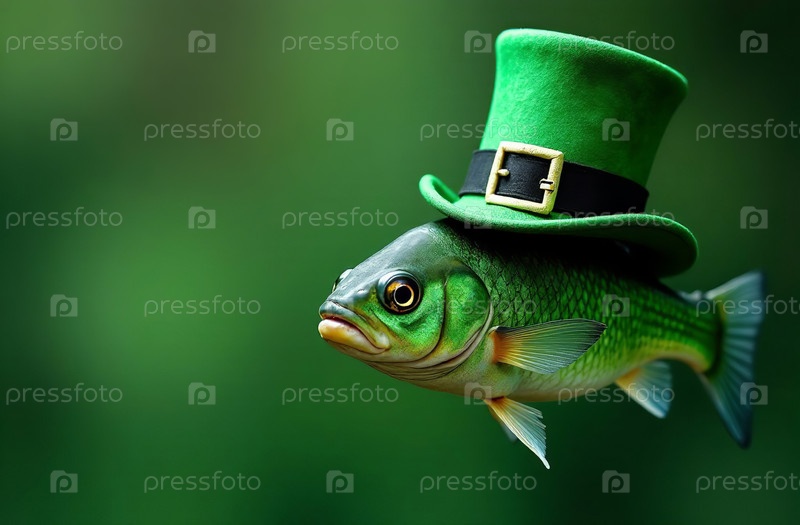 AI Generative Animal Fish в традиционном зеленом ирландском шляпном костюме, открытке на День Святого Патрика