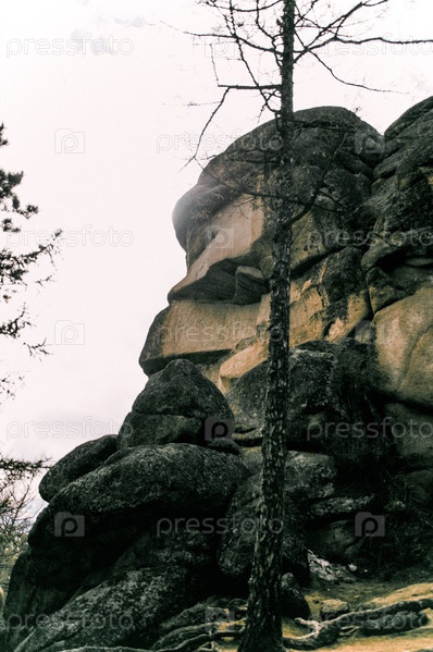 Ландшафт сибирских гор Столби, вершина горы в туманное лето