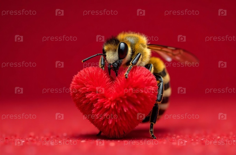 Карта Дня святого Валентина, пчела держит пушистое сердце на красном фоне