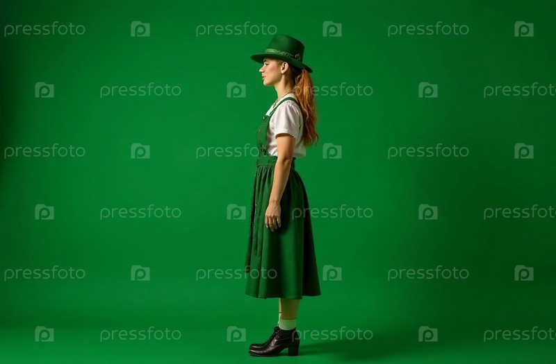 Женщина в традиционном ирландском зеленом костюме и шляпе стоит на зелёном фоне. Карта Дня Святого Патрика