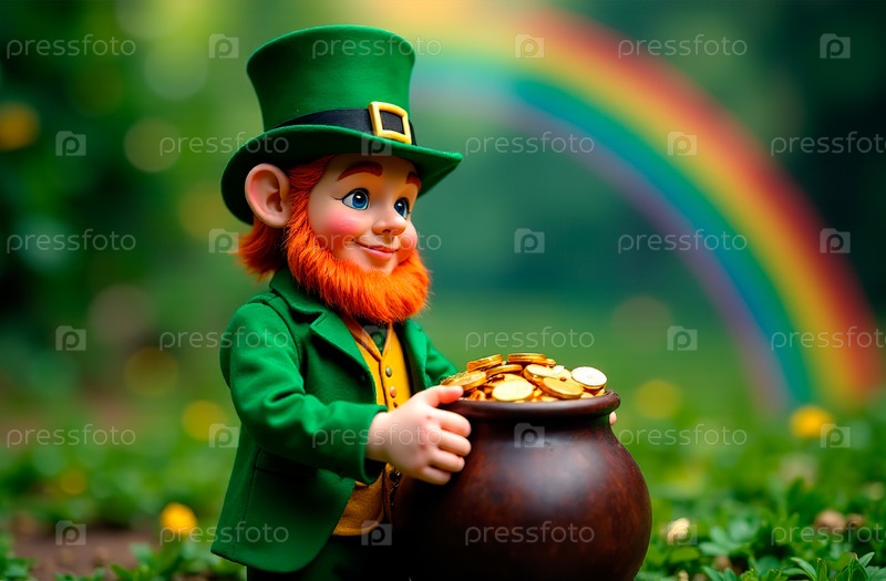 AI Generative Leprechaun в зеленом костюме с горшочкой золота стоит в лесу против радуги