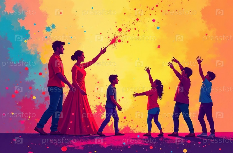 Люди в брызгах красочного Холи рисуют индийский весенний фестиваль