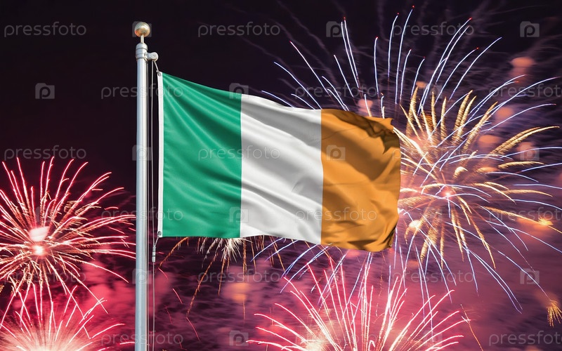 AI генеративный Национальный флаг независимости Ирландии, фон с фейерверком