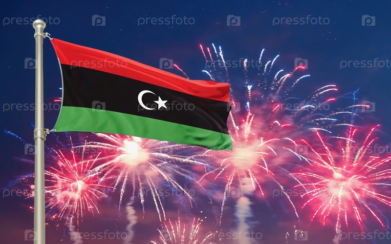 AI генеративный Национальный флаг Независимости Ливийского государства, фон с фейерверком